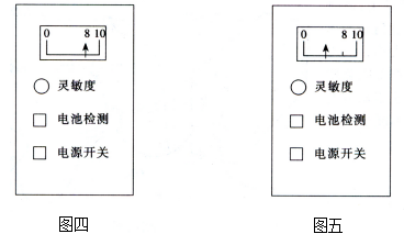 按下电池检测钮,表头若指示在“8”以上,说明电池正常,如图四所示。若按下电池检测钮,表头指示在“8”以下,则电池电压不足,在更换电池后方可使用,如图五所示。