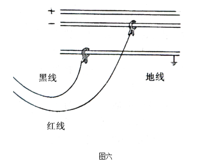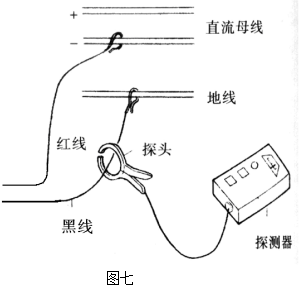 将探头分别卡于故障母线下属的各直流馈线上(DC+或DC-)。如果表头有指示,表明此线路有接地故障,并可继续向下级线路查找,如图八。